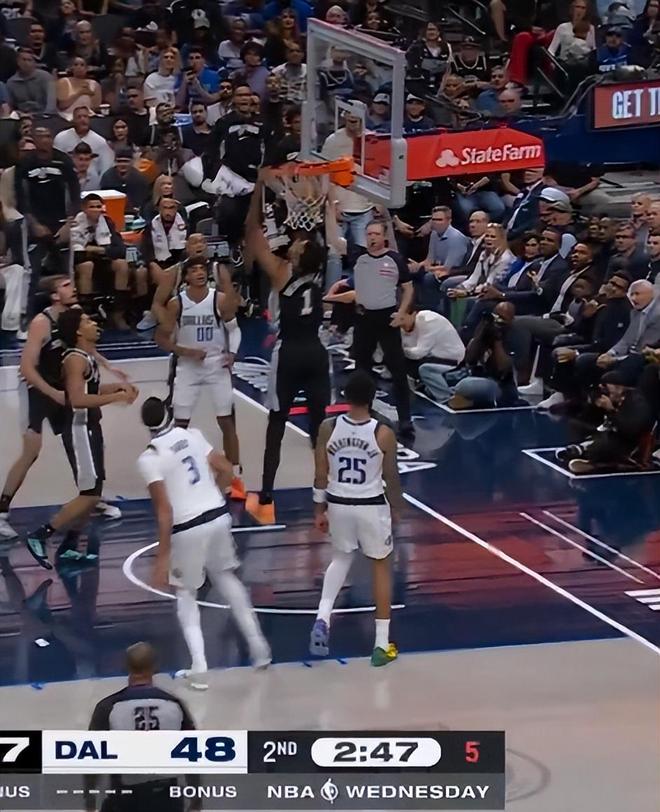 文班亚马实在是太猛了,一步过掉华盛顿后直接拉杆抡臂大风车反扣,这是一个7尺4寸的大个子球员能做出来的动作吗?一个2.24米(7尺4)的内线一步过一个2.01米的锋线,这是什么身体天赋?弗拉格只能望洋兴叹。
