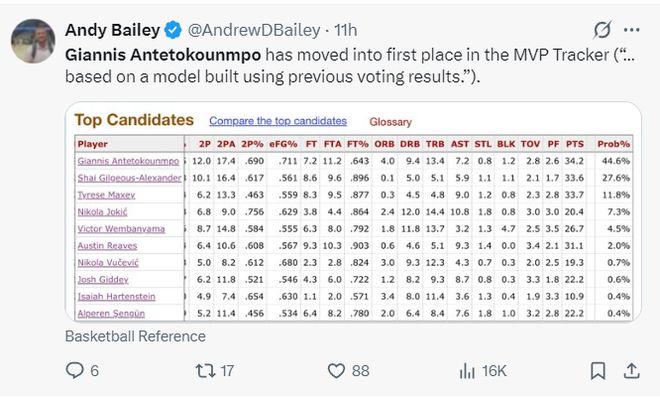 除此之外,在数据网站BBR上,扬尼斯的MVP概率高居44.6%排在联盟第一,SGA、马克西、约基奇、文班亚马都在扬尼斯之后。