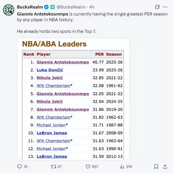 压哨绝杀!扬尼斯33+13无愧联盟PER第一 美媒预测MVP概率44%