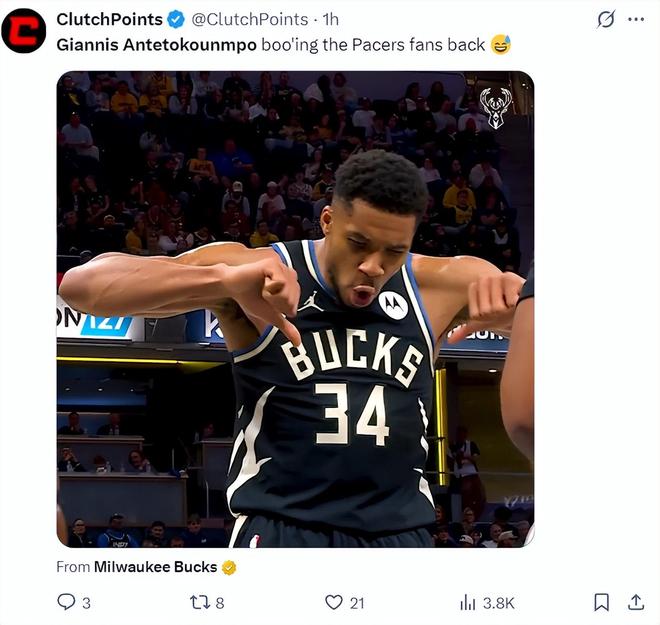 开场步行者球迷就给了扬尼斯很多的嘘声,字母哥在篮下暴扣后用双手拇指向下的怒吼回应了步行者球迷的嘘声,首节扬尼斯6分6篮板1助攻1抢断攻防很全面。